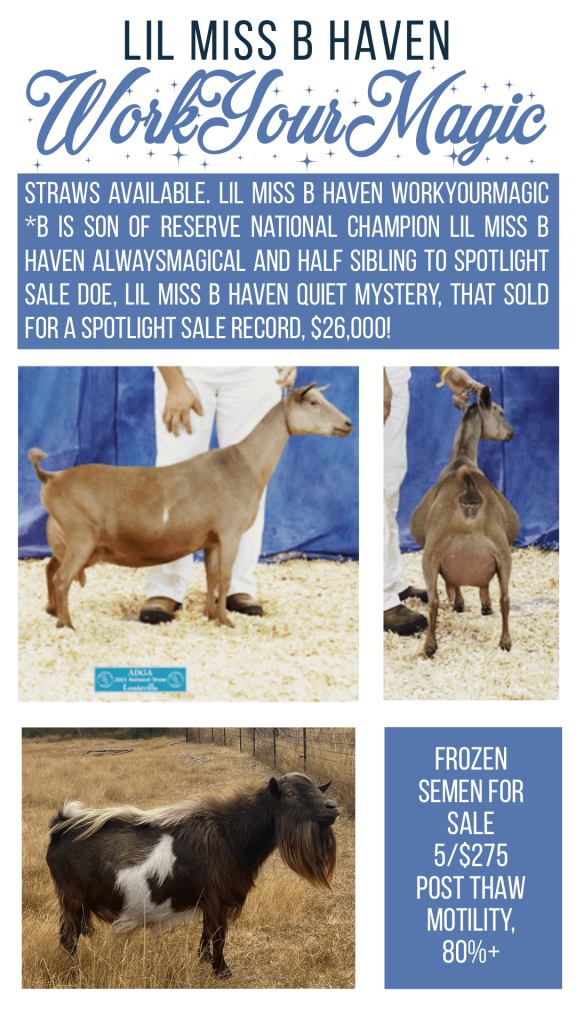 Dam: Lil Miss B Haven AlwaysMagical 3*M VVEE88 Magic is the son of ADGA 2021 Reserve National Champion AlwaysMagical, his grandsire TX Twincreeks RM Watermark was 2021 ADGA National Show Premier Sire!