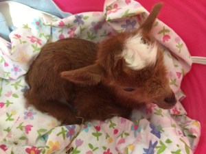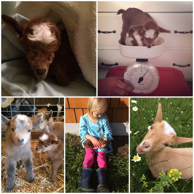 One year ago a tiny goat was born, she was 15, maybe 16 ounces at birth. She was weak and quickly became cold. We rushed her inside the house and I gave her a bit of honey on her gums hoping it might give her a little boost. I checked her temperature and it was low so we needed to warm her up, first we tried a heating pad and warm towels…but when that wasn’t enough we put her in the sink with very warm water (kids need to be at the correct temperature before they can have colostrum).