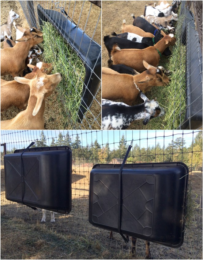 I also have used these wall feeders I unbolted the top hangers and turned them around so it hooks from the outside of our cattle panel, so the goats have to reach their heads through, otherwise they stand in the tray…more soiled hay.
