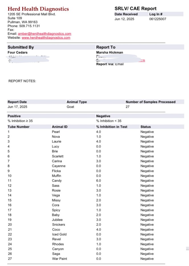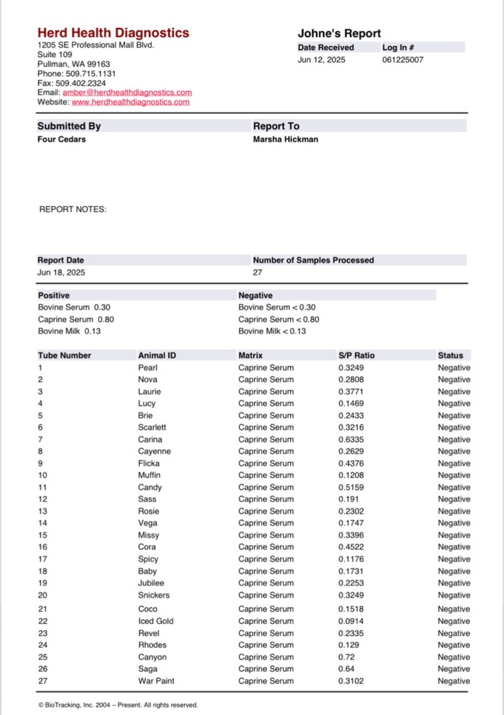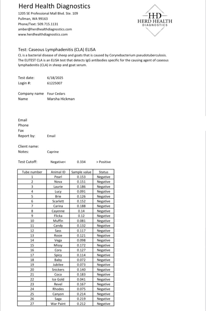 We have been testing our herd since 2013 and our herd has always been CAE, CL and Johne’s disease free. We use Herd Health Diagnostics and Washington Animal Disease Diagnostic Laboratory (WADDL), accredited veterinary testing labs. New goats are quarantined for a month and tested before being introduced to our herd. We use have copies of our test results from previous years and can provide them upon request. Our latest results are below: