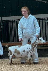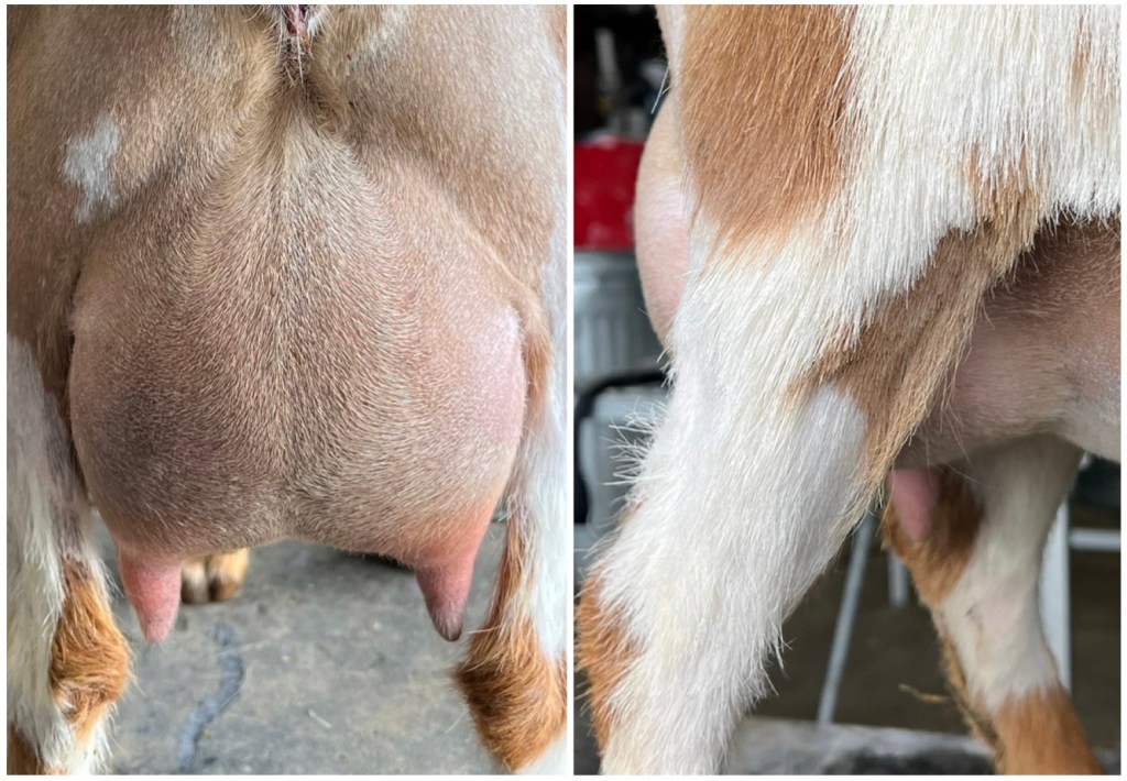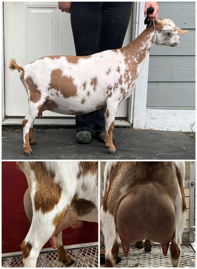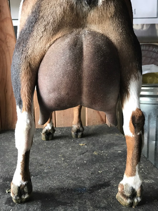 I am so excited to see Pearlee’s first freshening udder! She has high and wide attachments, nice medial, smoothly blended fore udder and plumb easy to milk teats. She had a single kid her first freshening, I am looking forward to next year! Her first show was at the Barn in the USA, it went very well especially considering the large and very competitive classes, she went 1st, 2nd and 4th in the 3 rings.