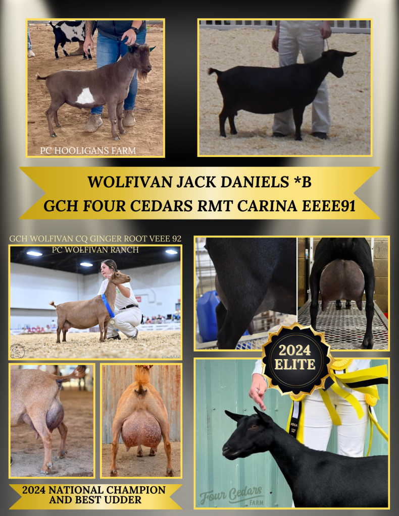 Sire: Wolfivan Jack Daniels (Wolfivan Jack of Diamonds X GCH Wolfivan CQ Ginger Root VEEE92 2024 ADGA National Champion)