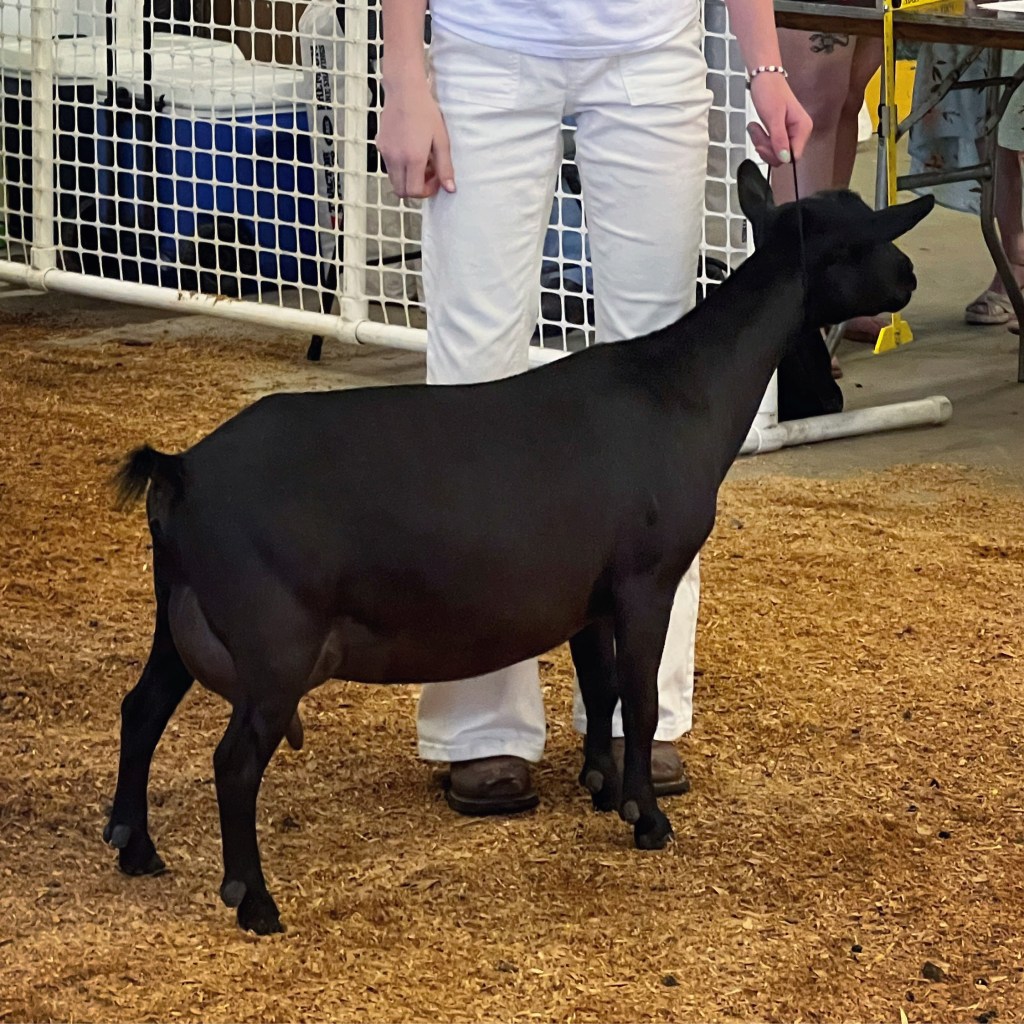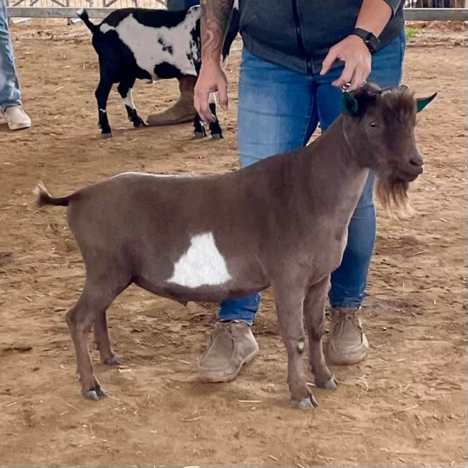 Planned Pedigree Another successful AI and one of my most anticipated breedings. Carina had a wonderful year in 2024, she is now a finished Champion as a 3 year old 2nd freshener, appraised EEEE 91, made the Elite List and milked 1,000 pounds. Carina has the widest rump width in the herd with a score of 44, she scored E’s and V in all structural categories, with E in front and rear legs and back and rump. Jack Daniels is the son of the 2024 ADGA National Champion and Best Udder, Wolfivan CQ Ginger Root VEEE 92. Kids from this pairing are available to active performance herds only (LA, DHI, Show). Doeling &/or buckling will be retained.